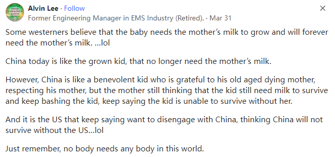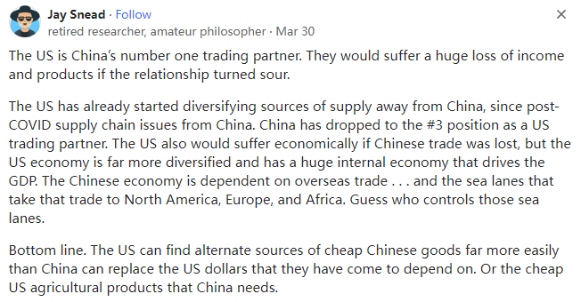 来源:https://www.quora.com/China-US-relations-Isnt-it-true-that-China-does-not-need-the-USA-and-can-get-along-very-well-without-any-relationship-between-the-USA-whatsoever