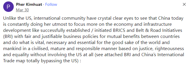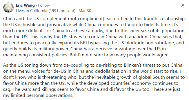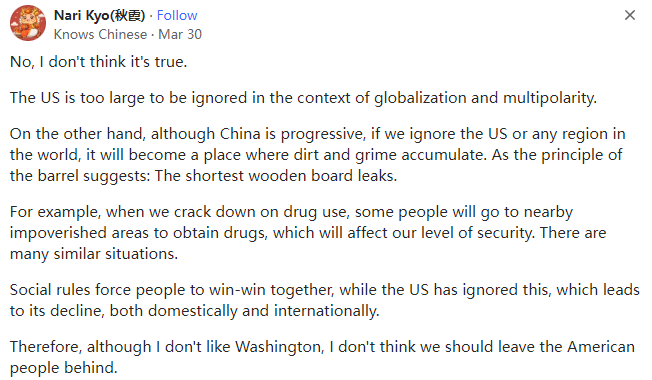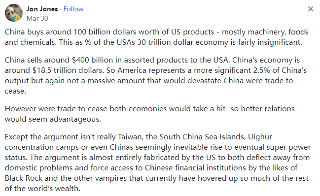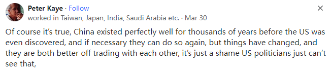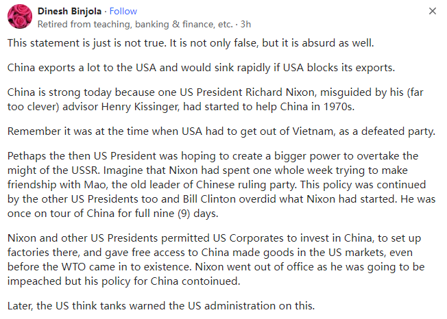 中美脱钩断链到如今,假如完全与美国断绝关系,中国会不会也能过得很好?本文译自Quora,原标题:China-US relations - Isn't it true that China does not need the USA and can get along very well without any relationship between the USA whatsoever?两个人可以离婚,每个人都可以生存下去,但用两份收入来分担家庭开支(尤其是房贷)总比一份收入要好。克林顿发起了全球化,而特朗普希望时光倒流,因此他发起了去全球化。全球化之后,各国在供应链等方面变得相互依赖。让时光倒流并非易事,否则大家都会受害。worked in Taiwan, Japan, India, Saudi Arabia etc,Lived in Curra Queensland Australia曾在台湾地区、日本、印度、沙特阿拉伯等地工作,曾在澳大利亚昆士兰州库拉市生活这当然是事实,在美国被发现之前,中国已经存在了数千年,如果有必要,它们还可以再这样做,但现在情况已经发生了变化,双方最好还是保持相互贸易,只可惜美国的政客们看不到这一点。但在20世纪70年代美国开放贸易之前,中国一直是一个第三世界国家。中国确实无法再回到毛时代的孤立和紧缩状态,因为中国有十五亿人要养活并让他们幸福,(回到孤立和紧缩状态)是不可能的。与美国不同,国际社会有一双清澈的眼睛,它们可以看到今天的中国一直在尽最大努力地专注于经济和基础设施建设,就比如它成功建立/发起了金砖国家组织和“一带一路”倡议(BRI),以公平合理的商业政策促进了国家间的互惠互利,并在不涉及美国的情况下,以文明、成熟和负责任的方式,在正义、公正和平等的基础上,为世界和人类的利益做了至关重要、必要和必需的事情(见所附的“一带一路”倡议和中国的国际贸易地图,它们都完全绕过了美国)。中国主导的“一带一路”倡议(BRI)是中国政府于2013年通过的一项旨在投资150多个国家和国际组织的全球基础设施发展战略。经过10年的艰苦努力和克服以及参与国的通力合作,“一带一路”倡议(BRI)已经创造了42万个就业岗位,并帮助4000万人摆脱了贫困。十年过去了,中国刚刚在北京举行了庆祝“一带一路”倡议(BRI)十周年的峰会,包括联合国秘书长在内的130个国家的领导人出席了峰会:与美国不同,中国永远不会卑鄙地以武力和军事手段胁迫/剥削其他国家以称霸世界。中国人是文明人,它更注重经济,它会以文明、成熟和负责任的方式,在正义、公正和平等的基础上,为世界和人类的利益做至关重要、必要和不可或缺的事情(见下文:美国前总统吉米-卡特谈中国的文章)以反映美国的虚伪、真实面目和丑陋的一面:在全球化和多极化的背景下,美国的规模太大了,它不容忽视。另一方面,虽然中国在不断进步,但如果我们忽视美国或世界上任何一个地区,它就会成为藏污纳垢的地方。正如木桶原理所言:最短的木板会漏水。例如,当我们打击毒品时,一些人会到附近的贫困地区获取毒品,这将影响我们的安全水平。类似的情况还有很多。社会规则迫使人们共赢,而美国却忽视了这一点,这导致了它在国内和国际上的衰落。因此,虽然我不喜欢华盛顿,但我认为我们不应该抛弃美国人民。retired researcher, amateur philosopher美国是中国的头号贸易伙伴。如果双方关系恶化,它们将蒙受巨大的收入和产品损失。由于中国在疫情后出现了供应链问题,美国已经开始将供应来源从中国转向其他国家。作为美国的贸易伙伴,中国已跌至第三位。如果失去与中国的贸易,美国也会遭受经济损失,但美国经济的多元化程度要高得多,而且它有庞大的内部经济来拉动GDP增长。中国的经济依赖于海外贸易......以及将这些贸易运往北美、欧洲和非洲的海上通道,猜猜谁控制了这些海上通道?一句话,美国找到廉价的中国商品的替代来源远比中国找到他们所依赖的美元或者中国需要的廉价的美国农产品的替代来源容易得多。Lives in California (1991–present)中美是互补的(这不是恭维)。在这一充满矛盾的关系中,美国充满了敌意和挑衅,而中国则继续跳“探戈”以韬光养晦。由于人口众多,中国比美国更难实现自给自足,这就是为什么美国不遗余力地遏制中国的原因。中国看到了这一点,但它仍绕过美国的封锁和破坏,以和平的方式扩大了“一带一路”倡议并悄然建立了自己的军事力量。与美国相比,中国在保持政策一致性方面具有决定性的优势,但我不知道有多少人会同意这一点。随着美国从“脱钩”到“去风险化”,再到布林肯威胁将中国列入菜单,中国的“去美国化”、世界的“去美元化”的声音开始高涨。我不知道谁在威胁谁,但全球南方不可避免的增长似乎对中国比对美国更有利,而发达国家的经济却在继续下滑。战争和杀戮似乎也有利于中国而不利于美国。以上这些只是我有限的个人观察。中国购买了价值约1000亿美元的美国产品--主要是机械、食品和化工产品,这在美国30万亿美元的经济总量中所占的比例微不足道。中国向美国出售了约4000亿美元的各类产品,中国的经济总量约为18.5万亿美元。因此,对美国的出口占中国GDP的2.5%是比较重要的,但同样它并不是一个巨大的数字,即使与美国的贸易停止,也不会对中国造成毁灭性的打击。然而,如果停止贸易,两国经济都会受到打击,因此改善关系似乎是有利的。不过,我们争论的焦点并不是TW、南海诸岛、W族集Z营,甚至不是中国似乎不可避免地崛起为超级大国,这些论点几乎完全都是美国捏造出来的,这既是为
