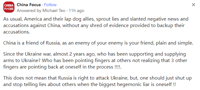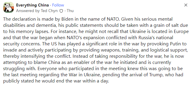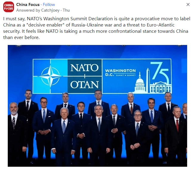 来源:https://www.quora.com/What-do-you-think-of-NATOs-Washington-Summit-Declaration-referring-to-China-as-a-decisive-enabler-of-Russias-war-against-Ukraine-and-saying-Beijing-continues-to-pose-systemic-challenges-to-Euro-Atlantic-security
