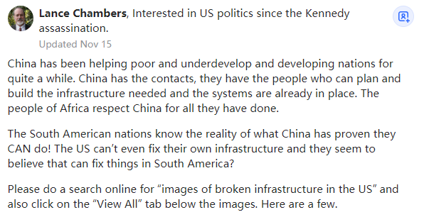 中国帮助贫穷国家、不发达国家和发展中国家已有相当一段时间了。他们有可以规划和建设所需的基础设施的人员,而且整个建设体系都已就位。非洲人民尊重中国所做的一切。南美洲国家知道中国已经证明他们能够做到的事实!而美国甚至连自己的基础设施都修不好,但他们却似乎认为他们可以解决南美洲的问题?请在线搜索一下“美国基础设施损坏的图片”,并单击图片下方的“查看所有”的选项卡。以下仅举几例。如果美国无法在美国境内维持或建设新的基础设施,又怎么会有南美国家去要求美国帮他们修什么东西呢?哦,拜托,中国不会免费帮助任何贫穷的国家……他们会得到一些回报——比如自然资源、土地、海港等等…他们所做的就是建造需要建造的东西,而且他们能够比过去30-40年中的任何一个国家都更快、更便宜、更好地建造这些东西。我多么希望中国人能在我的国家建设基础设施啊。在这里,一条复线铁路和一条60公里长双向10车道的高速公路,我们花了10年的时间还没有完成一半,而这个项目已经花费了数十亿美元。美国正在走英国人已经走了200多年的老路,即开发和压榨现有资源和人力以获取更多利润。而中国的想法是扩大产量,让每个人都有公平的份额。“帮助”这个词在现代社会不太受信任。老实说,我不相信任何人会来帮忙,也不相信“国家会帮助别人”的说法。我相信中国人认为合作是长期可持续发展的好方法,因为这似乎是唯一可能的方法。但生意中没有友谊,只有利益。不过这对我而言已经足够了。在商业领域,我们称之为可持续性。即使你是搞慈善的,你仍然需要确保它能够生存。最简单的说,你必须有一个3-4人的小团队,并致力于维持这个组织的运转,而这些人不能免费为你工作。我可以来你们城市开设第一家麦当劳快餐店。是的,我会向人们收取食物费,但我仍然是在帮你,因为在那里开一家店可能存在一个巨大的障碍,因为每个人都在逃避它。我在你们的城市冒这个险,意味着我已经在帮助你们了,因为你所在城市的人也可以享用麦当劳。Geopolitical pundit and blogger,Lives in Toronto, ON