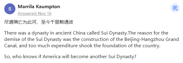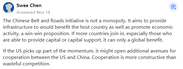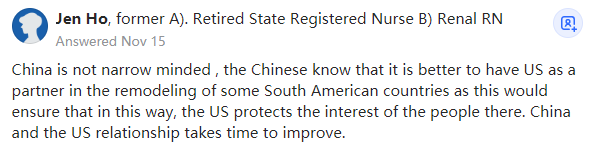 前A)退休的注册护士 B)肾脏科护士,生活在新加坡中国并不狭隘,中国人知道,在重塑一些南美国家的过程中,最好有美国作为合作伙伴,因为这将确保美国以这种方式保护那里人民的利益。中美关系需要时间来改善。中国的“一带一路”倡议并非垄断,其目的是提供基础设施,使东道国受益,并促进经济活动,这是一个双赢的主张。如果有更多的国家加入,特别是那些能够提供资本或资本支持的国家,这将为全世界带来利益。如果美国抓住了这一机会,它可能会为美中之间的合作开辟更多的渠道。合作比浪费性竞争更有建设性。