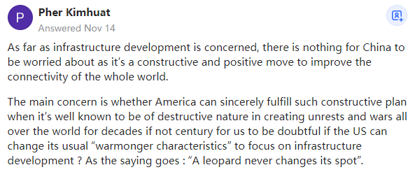 中国为什么要担心呢?一带一路倡议一直致力于将中国的产品和公司推广到不太幸运的发展中国家。“一带一路”将为这些国家带来繁荣,这也将使它们为中国公司带来利润。它在政治方面的目的是次要的,并且已经基本实现。在联合国大会的每一次投票中,中国都能轻而易举地获得了90多张支持票,而美国阵营的支持票通常在50票左右。因此,美国在南美洲建设更多的基础设施正是中国想要的。就基础设施发展而言,中国没有什么可担心的,因为这是一项建设性的积极举措,旨在改善整个世界的连通性。中国主要的担忧是,美国是否能够真诚地履行这样的建设性计划。因为众所周知,在过去的几十年乃至一个世纪的时间里,美国在全世界制造了许多具有破坏性的战乱和战争,我们怀疑美国是否能够改变其一贯的“战争贩子的特征”,将重点放在基础设施建设上?因为俗话说:“江山易改,本性难移”(A leopard never changes its spot,也即狗改不了吃屎)。former A). Retired State Registered Nurse B) Renal RN,Lives in Singapore