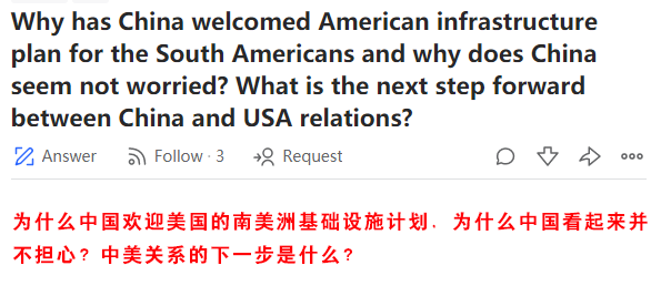 网文来自网友原文翻译投稿,所有言论皆不代表本站立场 | 本文文字/图片来自网络,侵删 | 点击页眉也可刷新 | 本文内容仅供娱乐,不作任何严肃之用途为什么中国一点都不担心美国推出的南美洲基础设施计划?中美关系的下一步是什么?本文译自Quora,原标题:Why has China welcomed American infrastructure plan for the South Americans and why does China seem not worried? What is the next step forward between China and USA relations?Interested in US politics since the Kennedy assassination.