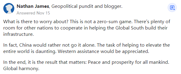 有什么好担心的?这不是一个零和游戏。在帮助全球发展中国家建设基础设施方面,其他国家还有很大的合作空间。事实上,中国也不愿单干,因为帮助发展全世界的任务是很艰巨的,如果西方愿意伸出援手,中国将不胜感激。最终,重要的是结果:全人类都会享受和平与繁荣,全世界都会实现和谐。如果你注意到中国的目的是贸易和投资,那么你会很快意识到,中国将欢迎在南美或其他地区的任何基础设施建设计划,因为基础设施将促进贸易和投资。我认为,随着西方反|华情绪的蔓延,许多人没有意识到的是,无论两国作为世界上最大的两个经济体还能联合起来做些什么,中国在与美国打交道和与美国合作进行各种商业冒险方面没有问题。问题在于美国不想与中国牵扯在一起,而是试图推翻中国,以维持其作为唯一的世界超级大国的地位:美国#1! 无知、傲慢和落后的心态不利于世界的繁荣,反而有利于世界的毁灭!如果有选择,谁愿意每天赤脚步行到村子里的河边去背回一桶饮用水?有些人可能理所当然地拥有基本的生活要素,但许多人却没有。拥有基础设施对许多其他人来说很重要,因此,帮助他们建设基础设施可以为各方带来好处。