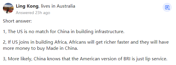 2. 如果美国参与建设非洲,非洲人将更快地变得更富有,他们将有更多的钱购买中国制造的产品。3. 更有可能的是,中国知道美国版的“一带一路”只是口头说说而已。感谢诸位亲的相伴与支持,由于个别文章的用词和地图使用不规范,全部文章会在审核整理之后陆续上架,新翻译的文章会特别标注,未做标注的为发布过的文章。为避免误点收费文并祝大家新年快乐,所有1月17日之前注册的用户均已获赠1000花瓣,敬请查收。每日登陆送5花瓣 | 联系方式:QQ-1399710240 ,有任何问题请发邮件或者加QQ。