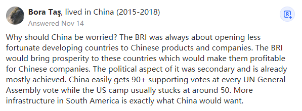 来源:https://www.quora.com/Why-has-China-welcomed-American-infrastructure-plan-for-the-South-Americans-and-why-does-China-seem-not-worried-What-is-the-next-step-forward-between-China-and-USA-relations