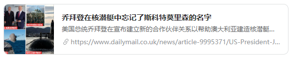 北京:美国总统拜登继续在“遏制中国”的政策上犯蠢,他最初的计划是说服世界上大多数国家在北京问题上站在华盛顿一边,但他的这一策略失败了。许多国家倾向于中立,因为它们与两国都有良好的经济合作。随后,拜登缩减了计划,提出了一个明显的“亚洲vs中国”战略,称之为印度-太平洋战略(Indo-Pacific Strategy)。五角大楼承诺向除中国以外的所有亚洲国家提供更深入的军事支持,并在台湾岛附近部署美国的海军舰艇。美国副总统卡马拉·哈里斯(Kamala Harris)上个月访问了新加坡和越南,但她抵达时并没有大张旗鼓,而东南亚地区的两国政府也拒绝选边站。东盟成员国刚刚目睹了美国在阿富汗灾难性的撤军,他们认为美国武装部队缺乏在紧急情况下保护盟友的决心,哈里斯副总统的东南亚之行的时机选择也很糟糕。喀布尔的混乱也影响了华盛顿的“四国联盟”(Quad)战略。“四国联盟”由澳大利亚、日本、印度和美国组成。但最近几周,东京和德里似乎正在重新考虑这个问题。日本首相菅义伟宣布了他的辞职计划,而印度总理莫迪近几周一直保持沉默。许多美国公司也关闭了在印度的工厂。所以现在拜登开启了“第四轮”针对中国的联盟,它被称为“AUKUS”。看起来是美国与英国和澳大利亚结成联盟,共同开发核潜艇网络。英国首相鲍里斯·约翰逊(Boris Johnson)认为这一战略有好处,因为伦敦与布鲁塞尔的外交关系紧张,他们可以用对AUKUS的支持从华盛顿那里换取更大的支持。与此同时,澳大利亚总理斯科特·莫里森是一位狂热的反华政治家。一些澳大利亚媒体对中国持强硬的态度。因此,即使这些措施对堪培拉的国内经济造成了很大的损害,堪培拉也将追随华盛顿。北京对澳大利亚公司采取了更严厉的贸易行动。因此,我预计新战略将像其他计划一样步履蹒跚,中国不会受到太大伤害。你还必须考虑新西兰对AUKUS的看法,新西兰总理雅辛达·阿登没有采取反华立场。此外,拜登似乎并不十分尊重澳大利亚的斯科特·莫里森。拜登在本周早些时候的白宫仪式上宣布了新的三边伙伴关系,莫里森也出现在了一个电话会议视频中。但据《每日邮报》报道,拜登记不起莫里森的名字。链接如下:“美国总统拜登在宣布美国和英国将帮助澳大利亚建造一支核动力潜艇舰队时,似乎忘记了斯科特·莫里森的名字。澳大利亚总理与拜登先生和英国首相鲍里斯·约翰逊一起参加了一次历史性的三方记者招待会,宣布成立“AUKUS”联盟,以应对中国在太平洋地区令人担忧的崛起。但当他感谢在他之前发言的其他两位领导人时,拜登先生似乎忘记了澳大利亚总理的名字。”拜登似乎对澳大利亚及其领导层并不十分熟悉。由于这种不屑一顾的态度,华盛顿不大可能与堪培拉保持稳定的关系。Lives in Marseille, France