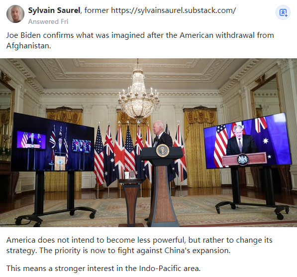 美国并不打算削弱其实力,而是要改变其战略,它现在的当务之急是对抗中国的扩张。美国正在将跨大西洋两岸的关系撇在一旁,转而关注这个未来将在其中发挥作用的地区。这个地区集中了世界60%的人口,而且经济还在不断增长。顺便说一句,我们注意到美国很少关注法国,而法国本应它的是一个主要的军事伙伴。这将在外交层面留下印记。与澳大利亚和英国在技术和军事层面的战略伙伴关系是第一步,美国将向它的盟友出售其军事技术。除了这一有可能重振全球核扩散的三边军事联盟之外,美国将继续在与印度、日本和澳大利亚的四国联盟中向前迈进。美国可能很想与日本和韩国结成军事同盟,但这两个国家由于地理位置接近中国而更加谨慎。美国所做的所有这些事情只会加剧世界两大巨头之间的冷战。这又是美国及其盟友(最突出的是英国和澳大利亚)出于政治动机联合起来对付中国的另一种常见做法。这就是我们在国际上所说的“出于政治动机的帮派主义”,它们小心翼翼地联手以威胁世界上的任何一个国家,只有懦夫才会结伙欺负一个人。幸运的是,在经历了所谓的“百年屈辱”和“鸦片战争”的尴尬之后,今天的中国有足够的力量和充分的准备来对付这种“出于政治动机的帮派主义”,former Director (2000-2005),Lives in Auckland, New Zealand2000–present
