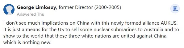 前董事(2000-2005年),2000年至今生活在新西兰奥克兰我看不出这个新成立的联盟对中国有多大影响。它只是美国向澳大利亚出售一些核潜艇的一种手段,并向世界表明这三个白人国家正在联合起来对抗中国,这并不是什么新鲜事。former Healthcare CFO,Lived in San Francisco1981–1988