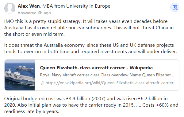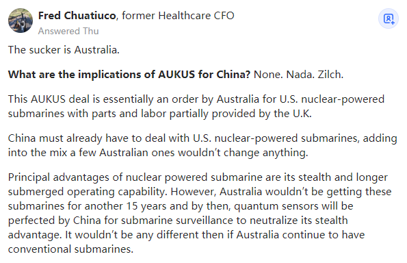 前Healthcare首席财务官,1981-1988年生活在旧金山这笔AUKUS协议的本质是澳大利亚从美国订购核潜艇,其中部分零件和劳动力由英国提供。中国肯定早就在与美国的核潜艇打交道了,再加上几艘澳大利亚的核潜艇也不会改变任何事情。核潜艇的主要优势在于其隐身能力和较长的水下作业能力。然而,澳大利亚在未来15年内都不会获得这些潜艇,到那时,中国将完善用于潜艇监视的量子传感器,以抵消其隐身优势。那时澳大利亚是用核潜艇还是常规潜艇,不会有什么不同。Ø 对美国来说,这是又一笔丰厚的军火交易——这次是从法国偷来的,它还扔了一块骨头给英国,让其为澳大利亚建造的潜艇提供一些劳斯莱斯公司的零件和一些劳动力。Ø 对英国来说,这是全球帝国的重现,它可以在印度-太平洋竞技场和大男孩们一起玩,并签订交付潜艇的合同。Ø 对澳大利亚来说,这是一笔巨大的账单——比从法国订购的常规潜艇订单要大得多。核动力潜艇意味着要提前支付30年的燃料供应,还要建立处理核燃料的基础设施和生态系统,并培训技术要求更高的船员来维护和运行潜艇.......以及退役成本。还有与法国一起协调了五年的沉没成本问题。美国现在将有两个非常愿意为它巡逻南中国海的代理人。它还有什么不喜欢的?MBA from University in Europe,Lives in Hong Kong