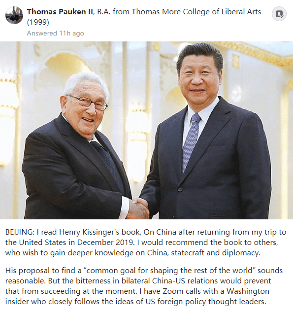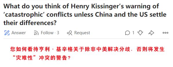 网文来自网友原文翻译投稿,所有言论皆不代表本站立场 | 本文文字/图片来自网络,侵删 | 点击页眉也可刷新 | 本文内容仅供娱乐,不作任何严肃之用途如何看待基辛格关于除非中美解决分歧,否则将发生“灾难性”冲突的警告?本文译自Quora,原标题:What do you think of Henry Kissinger’s warning of ‘catastrophic’ conflicts unless China and the US settle their differences?