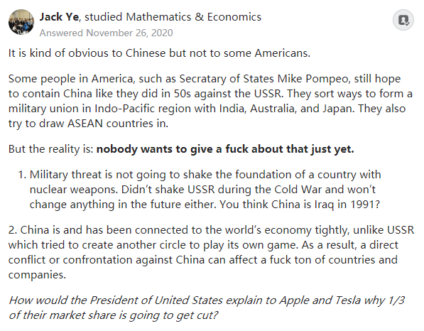 这对中国人来说是显而易见的,但对一些美国人来说不是。美国的一些人,如前国务卿迈克·蓬佩奥,他仍然希望像上世纪50年代对抗苏联那样遏制中国。他们想方设法在印度-太平洋地区与印度、澳大利亚和日本组成军事联盟,他们还试图吸引东盟国家加入。1. 军事威胁动摇不了一个有核国家的根基,它在冷战期间没有动摇苏联,在未来也改变不了任何事情。你觉得中国是1991年的伊拉克吗?2. 与苏联试图创造另一个圈子关起门来玩自己的游戏不同,中国现在和过去都与世界经济紧密相连。因此,与中国的直接冲突或对抗可能会影响到许多国家和公司。想象一下,美国总统将如何向苹果和特斯拉解释为什么他们将丢失1/3的市场份额?对于印度洋-太平洋地区的国家来说,加入这样的联盟也没有任何好处:美国鼓吹中国的危险->美国向这些国家出售武器并赚钱->美国很高兴…东盟国家从中得到了什么?如果东盟国家无视美国的提议->东盟与中国进行贸易并欢迎中国投资->东盟经济得到改善…中国和东盟都很高兴。这就是为什么只有印度如此热衷于反华,而东盟国家和澳大利亚、日本、韩国正在加入RCEP。他们想发展,想挣钱,他们不想发动一场毫无意义的战争,也不想向美国的战争机器捐款。