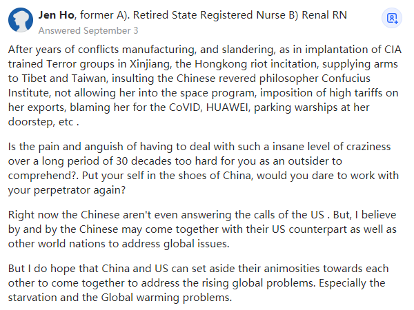 多年来,美国一直在中国周边制造冲突,它们在媒体上诋毁中国,在新|疆|植入经中情局训练的恐怖|组织,在香|港煽动骚|乱,向XZ和台|湾提供武器,侮辱以中国尊敬的哲学家的名义开设的孔子学院,不允许中国进入国际空间站,对中国的出口商品征收高额关税,并将新冠病毒、华为、以及军舰停靠在中国家门口等都归咎于中国。作为一个局外人,在长达30年的时间里,面对程度如此疯狂的欺凌,你会感到痛苦和苦恼吗?代入中国的角色思考一下,你敢再与作恶者合作吗?现在,中国人甚至连美国的电话都不接了。但是,我相信,中国可能会与美国同行以及其他世界国家一道解决全球问题。但我确实希望中美两国能够搁置彼此的仇恨,共同解决日益严重的全球问题,特别是饥饿和全球变暖问题。