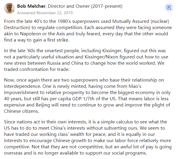 董事兼业主(2017年至今),2017年至今生活在佛蒙特州的South Hero从上世纪40年代末到80年代,超级大国使用相互保证(核)毁灭来管控竞争,每个人都假设他们所面对的是一个类似于拿破仑或轴心国的人,并且每天都在担心对方会找到一种发动先发制人打击的方法。到60年代末,包括基辛格在内的最聪明的人发现这不是一个特别实用的局面,基辛格/尼克松发现了如何利用苏联和中国之间的新的紧张关系来改变世界的运作方式,于是我们把对抗变成了贸易。现在,又有两个超级大国将他们的关系建立在了相互依存的基础上。一个是新兴起的中国,它们从MAO时代的贫困到现在的相对繁荣,只用了短短40年时间就成了世界上最大的经济体,但它们的人均GDP仍然只有美国的1/7,这意味着他们的劳动力比较廉价,所以北京还需要继续发展,以改善中国公民的困境。既然各国都是遵循自己的利益行事,那么看看美国必须做些什么才能满足中国的利益而不违背我们自己的利益就很容易了。因此,我们需要在中国(以及我们自己)的利益范围内,按照基辛格的话行事。(如果我能决策)我将通过取消工资税,降低所得税,然后对进入美国市场的商品征税来做到这一点。虽然提高关税会适得其反,但降低增值税可以对出口商和国内的制造商造成一些影响,使我们的人工成本稍微便宜一点,并使我们能够开始重建我们的中产阶级。是的,他说的是对的。今天的超级大国是世界上最大的经济体,每个国家都在各自的地区占据着主导地位,无论输赢还是平局,战争、代理战争甚至军备竞赛都将是一场灾难。