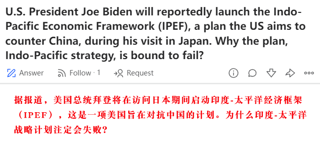 来源:https://www.quora.com/U-S-President-Joe-Biden-will-reportedly-launch-the-Indo-Pacific-Economic-Framework-IPEF-a-plan-the-US-aims-to-counter-China-during-his-visit-in-Japan-Why-the-plan-Indo-Pacific-strategy-is-bound-to-fail
