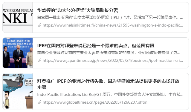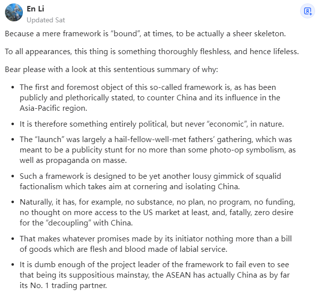 因为一个纯粹的框架有时会被“束缚”(bound)成一个纯粹的骨架。从表面上看,这个东西完全没有肉体,因此也就没有生命。Ø 这个所谓框架的首要目标,正如已经公开和官方声明的那样,是为了对抗中|国及其在亚太地区的影响力。Ø 因此,这在本质上是一种完全政治性的东西,与“经济性”没有任何关系。Ø 这次“发布会”基本上是一个大家都很熟悉的聚会,目的只是为了象征性地拍一些照片,以对大众进行宣传。Ø 这样一个框架被设计成了另一个肮脏的拉帮结派的拙劣伎俩,其目的是围堵和孤立中|国。Ø 所以很自然,它没有实质性的内容、没有计划、没有项目、没有资金,至少没有更多进入美国市场的想法,而且,致命的是它没有与中国“脱钩”的愿望。Ø 这使得它的发起人所作的任何承诺都不过是空口白话。Ø 该框架的项目负责人太愚蠢了,它甚至没有意识到作为其假定的支柱的东盟实际上已经把中国当做了其第一大贸易伙伴。我冒昧猜测一下,至少在2023年圣诞节之前,你不会听到任何关于这具温暖“尸体”的后续行动。这无疑是东盟的耻辱。然而,根据以下PBS(类似中国国家广播电台)的附件,这400亿美元可能只是给乌克兰的安家费(separation fee)。他们向乌克兰传达的信息是,如果他们不能支撑到9月,那么这笔钱将作为贷款提供。除此之外,乌克兰只能靠自己。有鉴于此,在他此次访问韩国和日本之后,他将再次关注国会选举和中国。通货膨胀和低民意支持率是他最头疼的问题,如果民主党想在这次选举中活下来,就必须解决这些问题。它只是一个框架,只是一个概念性的东西。虽然其意图十分明确,但一切都只是概念性的。RCEP和TPP有大量的文件来确保每个参与者的利益都得到关注,而《印太经济框架》(IPEF)在启动的时候只有一张纸,这并不能让每个人都安心,这似乎只是美国从其他国家那里得到一些东西的一种手段。从中我看到的是,忘了RCEP、东盟+1和TPP吧,《印太经济框架》(IPEF)没有像这三者那样的关税开放,一切都取决于各国与美国的单独谈判。这与过去并没有什么不同,只是现在美国将使用一些手段,比如让这些国家交出他们的技术诀窍,与中国断绝关系,以便与美国合作。这与其说是开放,还不如说是保护主义。我最初的想法是,只有新加坡会是东盟唯一加入其中的国家。我能想到的唯一原因是,东盟国家正在保持团结,因为他们非常清楚,如果他们不保持团结而是选择单独加入,他们将被忽视。东盟的经济总量超过了印度,同时其人口不到印度的一半。所以,他们的生产力比印度高很多。这种东盟的生存策略让我想起了汤姆·汉克斯(TomHanks)配音的动画电影《玩具总动员》(Toy Story)中的玩具们手牵着手穿过街道,以避免被高速车辆撞倒。东盟对《印太经济框架》感到非常缺乏信心,就像在这段视频中表现出的一样。啊,是的,拿1.5亿美元来打发我们,这太可笑了,因为现在这点钱在东盟内甚至连投资一个项目都不够。即使是菲律宾也可能会认为,尽管存在争议,但中国仍然愿意给他们一个项目。与此同时,它们与乌克兰的最新协议价值440亿美元。