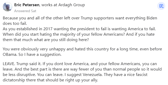 因为你和所有其他剩下的特朗普支持者都希望拜登所做的一切都失败。希望总统失败就是希望美国失败,正如你们在2017年成立时的那样。你们是从什么时候开始憎恨大多数美国同胞的?如果你们那么恨他们,你们还在留在美国干什么?你们显然很不开心,以至于很长一段时间以来都憎恨这个国家,这甚至发生在奥巴马担任总统之前。所以我有一个建议。离开。这是特朗普说的。如果你不爱美国和你的美国同胞,你可以选择离开。最棒的是你们比普通人要少得多,所以你们的破坏性更小。你们可以走了,我建议你们去委内瑞拉,那里有一个很好的法西|斯独|C政权,他们应该是你们的盟友。