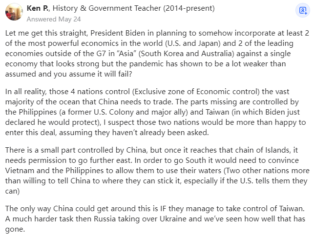 历史与政府教师(2014年至今),生活在佛罗里达州圣卢西港我就直说吧,拜登总统计划以某种方式将至少两个世界上最强大的经济体(美国和日本)以及两个七国集团以外的“亚洲”主要经济体(韩国和澳大利亚)合并到一个看起来很强劲的单一经济体中,但大流行已经证明这种单一经济体比想象的要脆弱得多,你觉得拜登会失败吗?实际上,这4个国家控制着中国进行贸易需要通过的绝大部分海域(包括专属经济控制区),剩下的部分则由菲律宾(前美国殖民地和主要盟友)和台湾地区(拜登刚刚宣布他将保护台湾地区)控制,我怀疑这两个国家/地区会非常乐意签署这项协议,如果他们被要求的话。这些海域有一小部分是由中国控制的,但一旦到了那条岛链,就需要得到许可才能进一步向东航行。为了南下,中国需要说服越南和菲律宾允许他们使用自己的水域(这两个国家非常乐意告诉中国让他们趁早拉倒吧,尤其是如果美国告诉他们可以这么做的话)。中国能够解决这个难题的唯一办法是他们设法收复台|湾,但这是一项比俄罗斯接管乌克兰更为艰巨的任务(我们已经看到事情进展得有多顺利)。