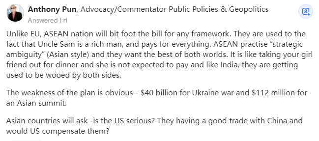 公共政策与地缘政治宣传/评论员,生活在澳大利亚悉尼与欧盟不同,东盟国家不会为任何框架买单,他们已经习惯了山姆大叔是个支付一切账单的有钱人。东盟实行的策略是“战略模糊”(亚洲风格),他们希望两边都不得罪。这就像带你的女朋友出去吃饭,她不需要付钱一样。也类似于印度,他们已经习惯了双方的追求。该计划的弱点显而易见——美国在乌克兰战争上花费了400亿美元,而用于亚洲峰会的只有1.12亿美元。亚洲国家会问——美国是认真的吗?他们与中国有着良好的贸易往来,如果有了损失美国会赔偿他们吗?