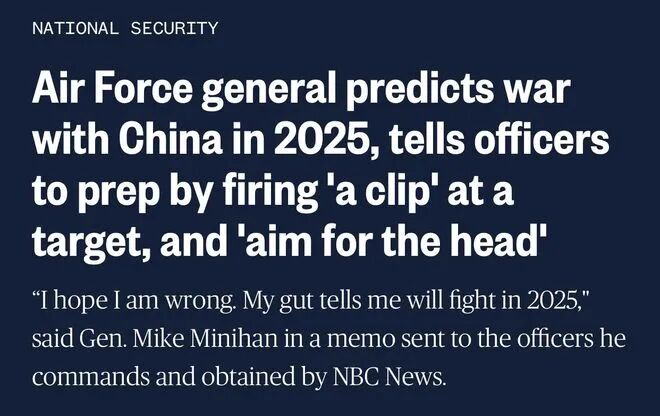 2023年1月30日,美国四星上将,美国伊利诺伊州斯科特空军基地司令迈克-米尼汉(Mike Minihan)向下属军官发送了一份备忘录,并对中美关系作出大胆预测:中美关系破裂的最根本原因,应该就是中国东南部的某个岛屿。他期望下属能做好准备,因为未来美军需要前出第一岛链,争取在第一岛链内消灭契丹军队,打一个大胜仗后结束战争。此前,美国一家叫做CSIS的智库对2026年可能到来的台海战争进行了兵棋推演,当时的兵棋推演只进行了一半,所以中美双方互有胜负;但是到现在这家智库的24轮兵棋推演已经全部完成,而这家智库也得到了一个结果:在这场战争中美国会获得胜利,但是也付出了巨大的代价,是一场惨胜。因为美军损失了2艘航母、10—20艘大型水面作战舰艇,并且在3周的时间里损失了3200名士兵,这是美军在阿富汗和伊拉克战斗20年的一半损失;不过也正是在这3周的时间里,美军成功地阻止了解|放|军解放台湾。中国需要进口食品、燃料和化肥,中国离不开这些进口商品。由于中国无法保护自己的海上航线,所以美国不必入侵中国,美国只需要阻止船只(进出中国)即可,我们可以很容易地做到这一点。契丹清楚这一点,因此它不会轻启战端,包括统一台湾。但有时领|导|者会犯错误。如果两国开战,契丹将在17个月内崩溃,就像过去经常发生的那样,她将分裂成大大小小的几块。台湾回归祖国是大势所趋,任何外部势力或非法组织都无法阻挡,岛内一些人对此看得更加清楚。以中国目前的军事实力,任何国家都无法从中国手中夺走一寸土地,甚至美国也无法阻止大陆收复台湾。无论美国多么傲慢,它都不得不承认在台海与解放军正面交锋,美国可能没有获胜的机会。别看现在那些台|独|机会主义者跳得很欢,一旦大陆准备动武解决台湾问题,那些机会主义者将率先逃离前线。一旦爆发战争,绝对不会只是台海两岸的局部战争,而会是全面开战,战场将不仅限于中国沿海水域或亚太地区,美国本土必将被卷入!中国必须明确划定界限,当战争达到一定程度时,中国不使用核武器的承诺将自动失效。除了武器和武装力量之外,即使是在战争前对中国实施类似于针对俄罗斯的制裁(更不用说在和平时期或战争中实施的海军封锁了)也足以有效地摧毁中国的经济,而夺取台湾(如果他们真的能够登上台湾岛的话)的所有好处充其量也只能说微不足道。这也将是中国作为一个正常运作的国家甚至一个民族的终结的最后一个印记。