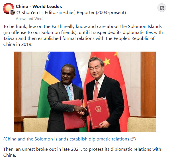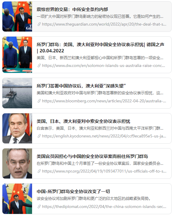 坦率地说,在所罗门群岛于2019年暂停与台|湾|地区的外交关系,然后与中华人民共和国建立正式关系之前,地球上很少有人真正了解和关心所罗门群岛(没有冒犯我们的所罗门朋友的意思)。随后,所罗门群岛在2021年底爆发了一场抗议其与中国的外交关系的骚乱。只要动动脚趾,你就能知道谁是动荡演变成骚乱的幕后黑手。为了保护在那里的海外华侨的利益,当时忙于处理骚乱的所罗门群岛政府没有更多的精力和能力来确保他们的安全,因此他们邀请中国警察提供帮助。所以,无论中国做什么,无论中国走到哪里,都是在破坏西方的利益!!!世界上的每一个可能对美国来说可能几乎没有什么意义的角落,一旦中国涉足,它们就在某种程度上成了美国及其一些盟友的“核心利益”。想想非洲的那些“屎坑国家(不是我说的,是特朗普说的)”,在中国在那里投资并与它们建立友好关系之前,美国真的关心过它们吗?想想那些在中国贸易伙伴名单上排名最高的东盟国家,在奥巴马时代所谓的“重返亚洲”以及现在拜登的“印太战略”之前,美国真的关心过它们吗?即使是美国的后院拉丁美洲,美国在过去几十年里对它们进行了多少投资和帮助?他们的移民现在还被美墨边境的“长城”拒之门外。所以,从地理角度来看,所罗门群岛本身并不是那么重要,但一旦中国介入,它就变得具有了地缘政治上的重要性。中国介入的任何地方和任何事情都可能成为美国及其一些盟友遏制中国影响力的“战场”。没错,你说得对。美国才是真正的战争贩子。很快,随着美元失去霸权,“老耻辱大叔”(译注:the old Uncle Shame,山姆大叔的化用)将无法在不破产的情况下维持其在全球的800多个军事基地。我迫不及待地想看到战争贩子的灭亡,并迎接世界和平。从你的发言中可以看出,殖民主义深深扎根于西方人的心中。所罗门群岛是一个独立的国家,它不应该成为一个国家的附庸。当西方认为一个独立国家无权与中国合作时,你们与你所反对的俄罗斯有什么区别?第三世界国家的人实际上看得很清楚,西方国家就是一群伪君子。