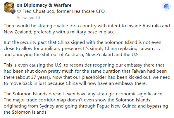 前Healthcare首席财务官,1981年至1988年生活在旧金山对于一个意图入侵澳大利亚和新西兰的国家来说,所罗门群岛将具有战略价值,最好在那里有一个军事基地。但中国与所罗门群岛签署的安全协议甚至不允许军事存在,中国只是简单地取代了台湾地区,这让澳大利亚、新西兰和美国感到恼火。这甚至导致美国重新考虑重新开放我们在那里的大使馆,该大使馆关闭的时间与台湾地区在那里的时间差不多(大约37年)。我们需要搬回去,因为中国现在将在那里有一个大使馆。所罗门群岛甚至没有任何战略经济上的意义,主要的贸易走廊地图(从悉尼出发,经过巴布亚新几内亚,绕过所罗门群岛)甚至没有标示所罗门群岛。中国的主要成就是将在联合国承认台湾地区的国家从16个减少到了15个。现在,如果中国能以某种方式赢得那里人民的心,也许他们就不会抢劫在那里的唐人街了。一次走一小步。对澳大利亚来说,最令人生气的是中国根本不在乎他们。中国与所罗门群岛讨论采矿前景,黄金开采等。巴布亚新几内亚和所罗门群岛拥有足够的矿产资源,这使得其比澳大利亚具有更重要的战略意义。