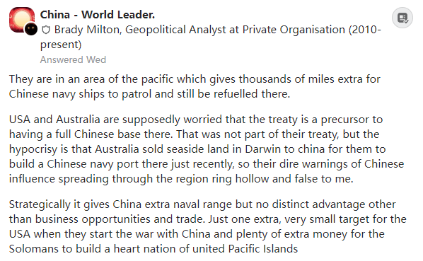 私营组织的地缘政治分析师(2010年至今),1946年至今生活在澳大利亚它们位于太平洋地区,这给中国海军舰艇提供了一个在数千英里外的额外的巡逻和补给基地。据推测,美国和澳大利亚担心该条约是中国在那里建立完整的军事基地的前奏。虽然这不是他们签署的条约的一部分,但虚伪的是,澳大利亚最近把达尔文的海边土地卖给了中国,让他们得以在那里建造一个中国海军的港口,所以他们关于中国影响力在该地区蔓延的可怕警告在我看来是空洞和虚假的。从战略上讲,这给了中国海军额外的航程,但除了商业机会和贸易之外,它提供不了其他明显的优势。当美国与中国开战时,这只是一个额外的、非常小的目标。