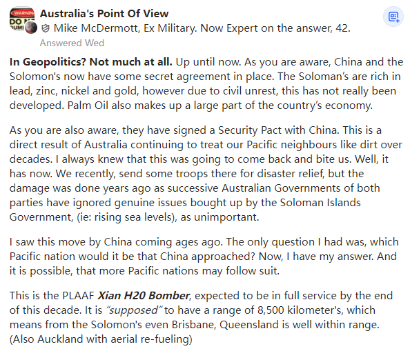 在地缘政治学上?没有太大价值,直到现在。正如你们所知,中国和所罗门群岛现在已经达成了一些秘密协议。所罗门群岛富含铅、锌、镍和黄金,但由于内乱,这些资源尚未得到真正的开发,棕榈油也占该国经济的很大一部分。正如你们所知道的,他们已经与中国签署了一项安全协议,这是澳大利亚几十年来一直把我们的太平洋邻国视为粪土的直接结果,我一直都清楚我们会自食其果。好吧,现在报应来了。我们最近派了一些军队去那里救灾,但由于历届澳大利亚政府都忽略了所罗门群岛政府面临的真正问题(即:海平面上升),所以伤害在很多年前就已经造成了。我在很久以前就预见到了中国的这一举动。我唯一的问题是,中国会接触哪个太平洋国家?现在,我有了答案。而且很可能更多的太平洋国家也会纷纷效仿。以下是解放军的西安H20轰炸机,预计将在本十年末全面服役。它“应该”有8500公里的航程,这意味着从所罗门群岛出发,布里斯班/昆士兰都在其航程之内(如果空中加油的话,还包含奥克兰)。无疑,这就是为什么中国应该在那里建立一个空军基地(更不用说海军设施)的原因了。这就是澳大利亚忽视邻国的代价,是莫里森和历届政府做出的最糟糕的决定。当他们忙于美国的事务时,中国再次成功地偷偷溜进了后门(或者在澳大利亚的例子中,是前门)。对于美国或澳大利亚可能对所罗门群岛实施的任何制裁,中国无疑会给予补偿。我想这将包括食品、机械和零件、燃料、家用物品等,你可以自己想象。如果解放军空军和海军继续推进军事设施建设,这也将改变整个太平洋的战略局势。尤其是对美国来说,中国将在关岛的另一边,从技术上讲,夏威夷也在其轰炸机的航程之内。这将要求美国海军考虑重新部署她们的舰队。记住,我说的是如果中国在南太平洋建造军事设施的话。如果中国真的在南太平洋建造了军事设施,中国对澳大利亚的威胁将增加100倍。虽然我们的政府指望印度尼西亚和菲律宾等国家能充当一个报警器,但情况可能不再如此。总而言之,目前的澳大利亚政府和澳大利亚自由党是活该,莫里森政府在没有必要的情况下无谓地激怒了中国,它盲目地让特朗普政府像牵着小狗一样牵着它转。现在,我们在汤斯维尔和达尔文的快速反应部队步兵基地有可能会在中国隐形轰炸机的航程之内。我们应该和中国讲和,和美国说再见。我们一开始就不应该跳上美国愚蠢的马车,看看它现在把我们带到哪里去了!!所以,现在来回答你的问题,从地缘政治角度来看,所罗门群岛迈出了登上世界舞台上的巨大的一步。