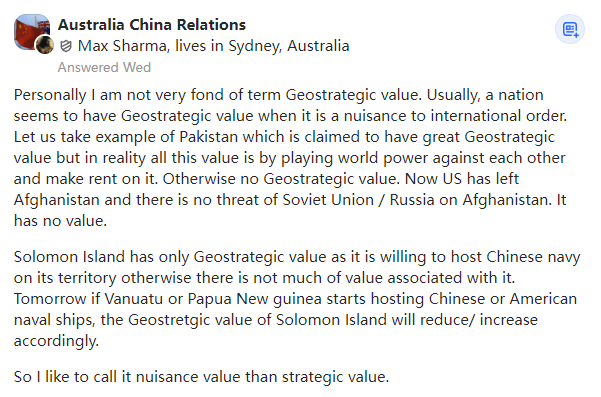 就我个人而言,我不太喜欢地缘战略价值这个词。通常,当一个国家对国际秩序造成滋扰时,它似乎就具有地缘战略价值。让我们以巴基斯坦为例,该国被认为具有巨大的地缘战略价值,但实际上,所有这些价值都是通过让世界大国相互对抗并从中获利来实现的,否则它就没有地缘战略价值。现在,美国已经离开阿富汗,苏联/俄罗斯对阿富汗也没有威胁,于是它就没有了(地缘战略)价值。只有当它愿意让中国海军在其领土上驻扎时,所罗门群岛才有地缘战略价值,否则它就没有多少价值。明天,如果瓦努阿图或巴布亚新几内亚开始接待中国或美国的军舰,所罗门岛的地缘战略价值将相应减少/增加。所以我喜欢称之为阻碍价值(译注:nuisance value,即给...造成麻烦的价值),而不是战略价值。