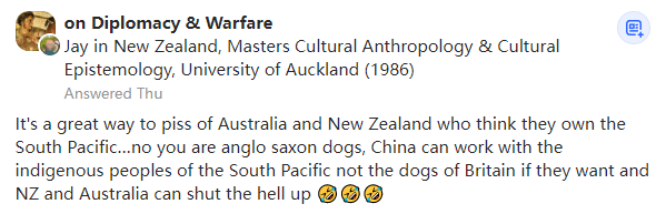 文化人类学与文化认知学硕士,奥克兰大学(1986)这是一个惹恼自认为拥有南太平洋的澳大利亚和新西兰的好办法…不,你们只是盎格鲁-撒克逊民族的狗。如果中国愿意的话,他们可以与南太平洋的土著民族而不是英国的狗合作,新西兰和澳大利亚应该闭嘴。