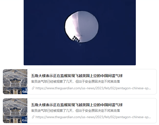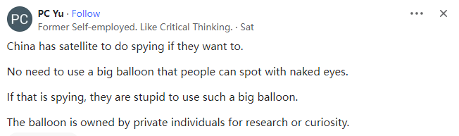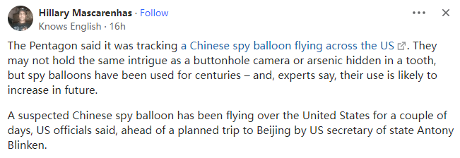 “击落我们的‘无害’气球?好吧,我们也可以玩这个游戏。从此,所有美国的间谍卫星现在都是合法的破坏目标。”看起来拜登把它击落了,我想我们很快就会看到中国在玩什么把戏。底线是美国军方知道他们正在做什么,但真正的问题是中国可以打美国的脸而拜登什么也不做...不要觉得气球是一个主要的威胁,真正的威胁是美国人/拜登选择什么都不做...这开创了一个先例,中国正在大笑。