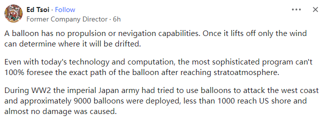 Former Company Director,Lives in Hong Kong气球没有推进或导航的能力,一旦它升空,只有风才能决定它将漂向何处。即使采用今天的技术和计算能力,最复杂的程序也无法100%预测气球在到达平流层后的确切路径。第二次世界大战期间,日本帝国军队曾试图使用气球袭击美国西海岸,它们部署了大约9000个气球,但只有不到1000个到达美国海岸,几乎没有造成任何损失。70年后,如果有哪个国家仍然认为气球可以作为武器,他们要么非常愚蠢,要么只是在故意制造恐惧和敌意。自第二次世界大战结束以来,美国一直在使用间谍飞机U-2和SR71在特定的航线上飞行以收集情报,这是侵略别国领土的一个非常恶劣的举动。U-2曾被苏联和中华人民共和国击落,飞行员被视为战俘并在几年后被释放。1960年,一架U2在苏联境内被击落,美国政府还声称这是一架执行科学任务的NASA拥有的飞机。美国决定不击落气球的原因很简单。虽然一门20毫米的大炮就可以在气球上打很多个洞,但气球仍然需要数小时或数天才能爆燃并到达地面。如果最后发现气球只配备了地理和天文设备,那么这只能证明美国政府在玩“狼来了”的把戏来愚弄她的公民。如果他们用导弹引爆气球,一切都将支离破碎,很难弄清楚气球携带的是什么样的设备。洲际弹道导弹发射台是固定的,如果需要任何情报,使用卫星将更加有用和精确。美国声称气球将被用来监视洲际弹道导弹发射台,这是一个只有6岁的小朋友才会相信的借口。