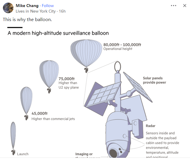 但对我们的军事基地获取的信息比这张照片要清楚20倍,还有来自红外的其他数据,谁知道还有什么。对中国来说,一个很大的问题是,美国让中国知道早在气球发挥作用之前它就被抓住了,美国允许气球进入美国领空有一个很大原因: