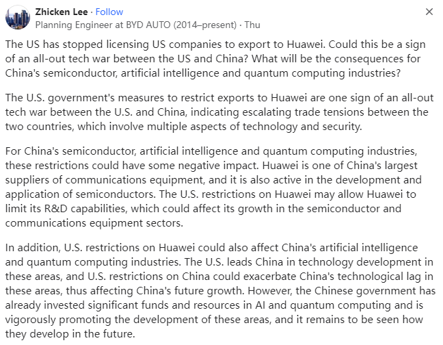 总之,目前的形势很复杂,很难预测确切的结果,但对华为的出口限制很可能会对美国和中国的技术格局产生重大的影响。