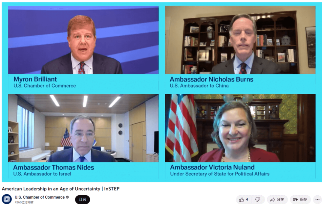当天,美国驻中国大使伯恩斯、美国驻以色列大使奈德斯以及美国副国务卿纽兰作为嘉宾参与视频讨论。其中,伯恩斯在谈及中美关系时声称,美国的地位比过去五到十年更加强大,中国现在也知道美国在多个方面都是亚太地区的领导者。