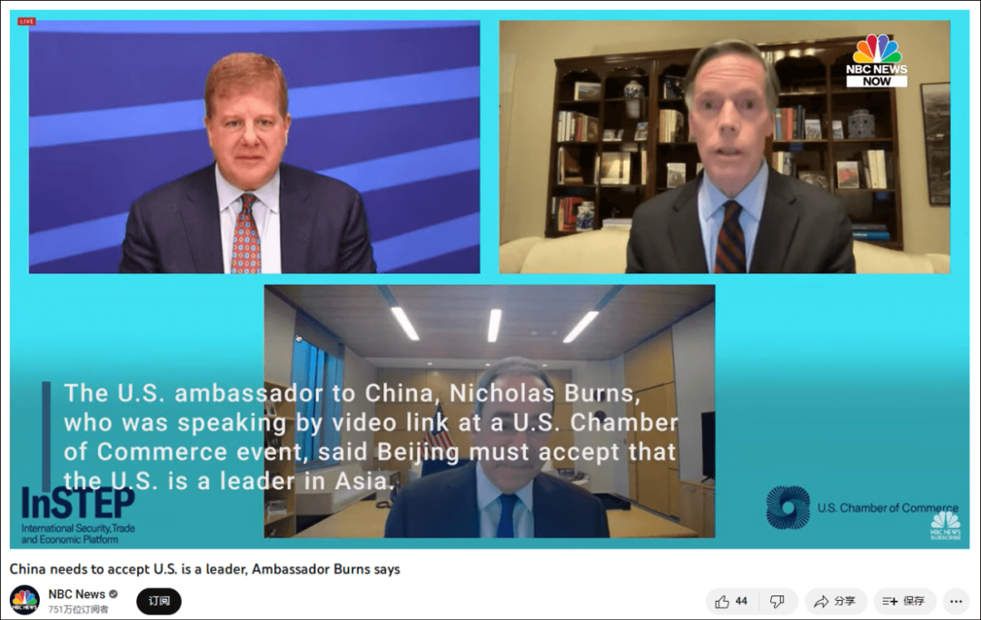 据报道,当天的线上活动邀请伯恩斯参与,自然避免不了谈及引人关注的中美关系问题。而在伯恩斯的多段讲话中,其中的一段特别引发了关注。伯恩斯首先认为,美国的地位比五年前或十年前更加强大,这得益于盟友和私营部门的支持,也得益于美国各大研究机构和大型科技企业的创新能力。随后,伯恩斯便说出了一段引发媒体注意的话,原话是:“我的的确确地认为,中国人现在知道,美国仍留在这个地区(即亚太地区),在很多方面都是这一地区的领导者,如同拜登总统每次谈到这个问题时都明确表示的那样,我们希望在未来同中国和平相处,不希望发生冲突,但我们会在该地区坚持自己的立场。”对于所谓的“坚持立场”,伯恩斯表示,自己担任美国驻华大使即将满一年,他对此感到“非常乐观”。此后,美媒NBC将这段讲话制作成时长一分多钟的短视频,发布于YouTube上,并在标题上作了改动。在视频中的字幕介绍中,NBC称“伯恩斯让中国必须接受美国是亚洲领导者”,而在标题处,NBC则称“伯恩斯说中国需要接受美国是领导者”。NBC这番小小的改动,确与伯恩斯所言不完全一致,但似乎又说出了伯恩斯所想。更重要的是,NBC也确实得到了它们想要的“网络流量”,许多网民纷纷在其YouTube视频评论区下方留言。Nicholas Burns, the U.S. ambassador to China, said that Washington was not seeking confrontation with Beijing, but U.S. leadership in some areas needed to be recognized.美国驻华大使尼古拉斯·伯恩斯(Nicholas Burns)表示,华盛顿并非寻求与北京对抗,但美国在某些领域的领导地位需要得到承认。Asia and the world needs a US that can work with other countries in solving the world's real problems and that means working with all countries of the world. What the world really doesn't need is a US that is always interested in confrontation, war making and in endless and useless fear mongering.亚洲和世界需要一个能够与其他国家合作解决世界的实际问题的美国,这意味着美国需要与世界各国合作。世界确实不需要一个总是对对抗、战争和制造无休止、无用的恐惧感兴趣的美国。