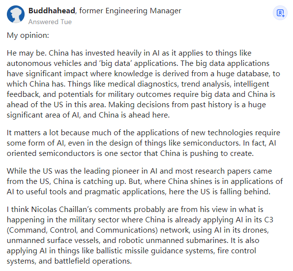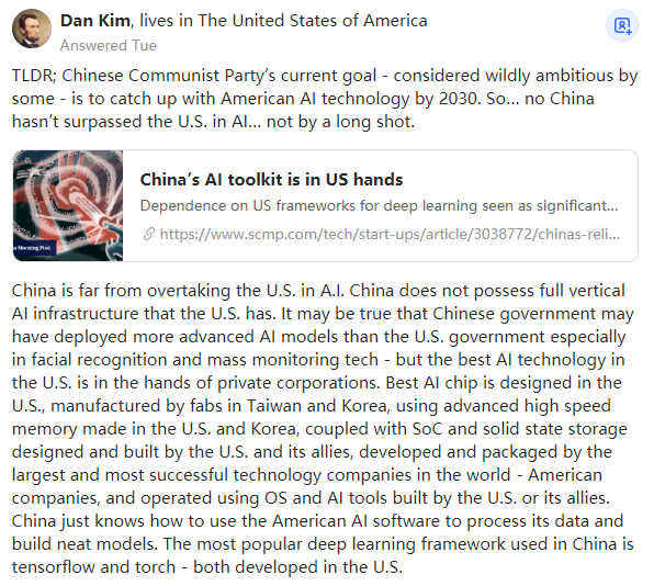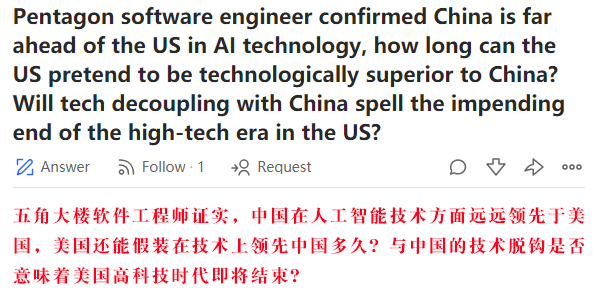 来源:https://www.quora.com/Pentagon-software-engineer-confirmed-China-is-far-ahead-of-the-US-in-AI-technology-how-long-can-the-US-pretend-to-be-technologically-superior-to-China-Will-tech-decoupling-with-China-spell-the-impending-end-of-the