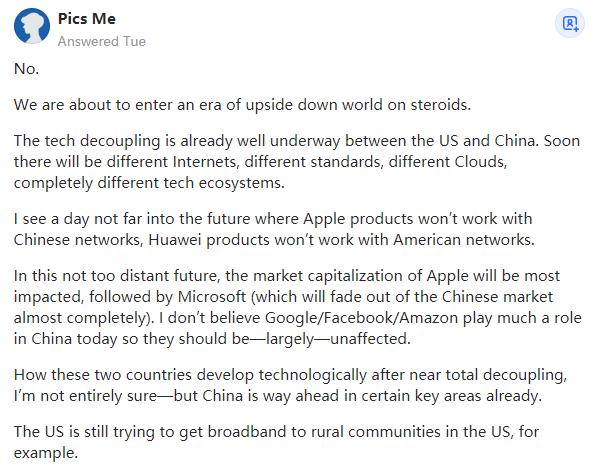 这同样适用于军事领域。每一位美国将军在国会面前都会表示中国的军事武器无论在数量上还是在能力上都比美国的武器更加强大。美国和中国之间的技术脱钩已经在顺利进行,很快就会有不同的互联网,不同的标准,不同的云以及完全不同的技术生态系统。我认为在不久的将来,苹果的产品将无法与中国的网络兼容,华为产品将无法与美国的网络兼容。在不久的将来,苹果的市值将受到最大的影响,其次是微软(微软将几乎完全退出中国市场)。我不相信谷歌/FACEBOOK/亚马逊在今天的中国扮演了多大的角色,所以他们应该基本上不受影响。在几乎完全脱钩之后,这两个国家在技术上如何发展我不完全确定,但中国已经在某些关键领域遥遥领先。承认网络安全漏洞(至少在短期内,其频率和严重性将增加)将成为美国的国家安全方面的问题。我可以看到有一天,为了让美国人民对他们的计算机系统的脆弱性一无所知,这些漏洞本身将被尽可能地掩盖。从这个意义上讲,美国社会将变得与20世纪50/60年代的苏联社会相似,当时苏联一遍又一遍地告诉它的工人,他们享有最高的生活水平,因为他们生活在苏联(显然,与当时的西方消费标准相比,这是不正确的)。但在那个尽管取得了技术成就,可是苏联公民的生活水平相对于西方同行正在迅速下降的时代,这些错误信息是维持苏联社会稳定的关键组成部分。