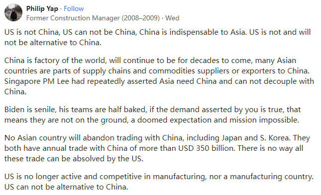 Former Construction Manager (2008–2009),Lives in Leeds, West Yorkshire, UK2012–present前施工经理(2008-2009年),2012年至今生活在英国西约克郡利兹美国不是中国,美国也不可能是中国。中国对亚洲来说是不可或缺的,美国现在不是,将来也不会成为中国的替代品。中国是世界工厂,其在未来几十年内将保持这一地位,许多亚洲国家都是中国供应链的一部分和大宗商品的供应商或出口商。新加坡总理李显龙多次表示,亚洲需要中国,亚洲无法与中国脱钩。拜登已是老态龙钟,他的团队都是些“半桶水”,如果你提出的说法是真的,那意味着他们已经脱离现实很久了,这注定只是空想和不可能完成的任务。没有一个亚洲国家会放弃与中国的贸易,包括日本和韩国。这两个国家与中国的年贸易额均超过3500亿美元,美国无法填补所有这些贸易空缺。美国的制造业不再有活力和有竞争力,它也不再是一个制造业国家。因此美国无法替代中国。