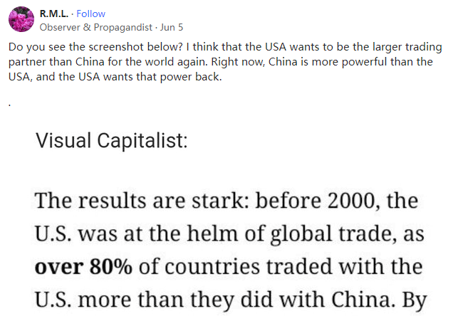 你看到下面的截图了吗?我认为美国希望再次成为世界上比中国更大的贸易伙伴。现在,中国比美国更强大,美国希望恢复这种力量。