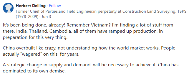 Former Chief of Parties,and Field Engineer,in perpetuity at Construction Land Surveying, TSPS (1978–2009),Lives in Dallas, TX1979–present前缔约方负责人和现场工程师,永久从事TSPS建设用地测量工作(1978年至2009年),生活在德克萨斯州达拉斯市(1979年至今)这事已经在做了!还记得越南吗?我从那里找到了很多东西。印度、泰国、柬埔寨,所有这些国家都提高了产量,它们都在为这件事做准备。中国疯狂地过度建设,它们不了解世界市场的运作方式。多年来,人们实际上在这方面“下了赌注”。为了实现这一目标,我们必须对供需进行战略性的改变。中国只能决定自己的命运。