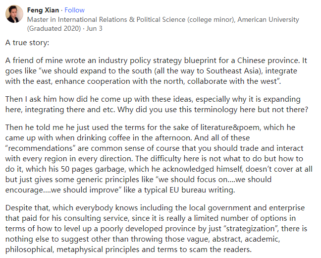 Master in International Relations & Political Science (college minor), American University (Graduated 2020)美国大学国际关系与政治学硕士(大学辅修)(2020年毕业)我的一个朋友为中国的一个省份撰写了一份产业政策战略规划,有点类似于“我们应该向南扩张(一直延伸到东南亚),与东方接轨,加强与北方和西方合作”。然后我问他是怎么想到这些想法的,尤其是为什么要在这里扩张,在那里整合,为什么你在这里而不是在那里使用这个术语等等。然后他告诉我,他只是因为文学和诗歌而使用这些术语,这是他在下午喝咖啡时想到的。当然,所有这些“建议”都是常识,你应该在各个方向与每个地区进行贸易和互动。这里的困难不在于做什么,而在于如何去做,他承认自己写的50页废话根本没有涵盖这一点,只是给出了一些普遍性的原则,如“我们应该关注……我们应该鼓励……我们应该改进”,就像典型的欧盟公文。尽管如此,包括为他的咨询服务付费的地方政府和企业在内的每个人都清楚,在通过“战略规划”来提升一个欠发达省份的选择方面是有限的,除了抛出那些模糊、抽象、学术、哲理之类的形而上学的原则和术语来欺骗读者之外,他们给不出什么而别的建议。