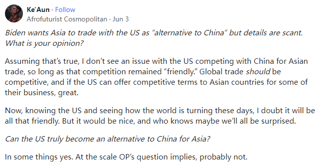 来源:https://www.quora.com/Biden-wants-Asia-to-trade-with-the-US-as-alternative-to-China-but-details-are-scant-What-is-your-opinion-Can-the-US-truly-become-an-alternative-to-China-for-Asia
