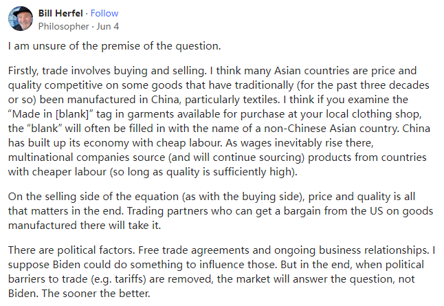 Philosopher,Lives in Hunter Valley首先,贸易涉及买卖双方。我认为许多亚洲国家的产品在价格和质量上都具有竞争力,尤其是在过去三十年左右的时间里,一些传统上在中国制造的商品(尤其是纺织品)。我认为,如果你检查一下当地服装店可供购买的服装上的“XX制造”标签,“XX”通常是非中国的亚洲国家的名称。中国用廉价劳动力建立了经济体系,但由于那里的工资不可避免地上涨,跨国公司会转而从劳动力成本较低的国家采购(并将继续采购)产品(只要质量足够高)。在等式的卖方一边,价格和质量最终才是最重要的。如果贸易伙伴能从美国那里买到便宜货,他们就会接受。的确会存在政治因素,比如自由贸易协定和持续的商业关系,但我想拜登可以做些什么来影响这些。但说到底,当政治贸易壁垒(如关税)被消除时,一切将由市场而不是拜登来决定。
