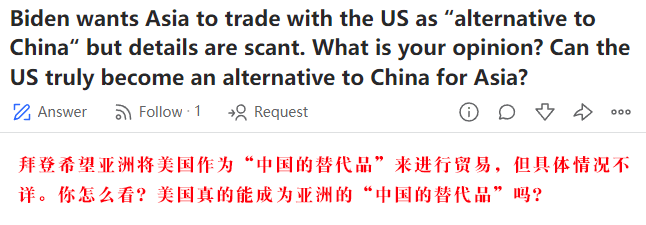 拜登想建立排除中国的贸易圈,美国真的有能力作为“中国的替代品”让亚洲转向美国吗?本文译自Quora,原标题:Biden wants Asia to trade with the US as “alternative to China“ but details are scant. What is your opinion? Can the US truly become an alternative to China for Asia?