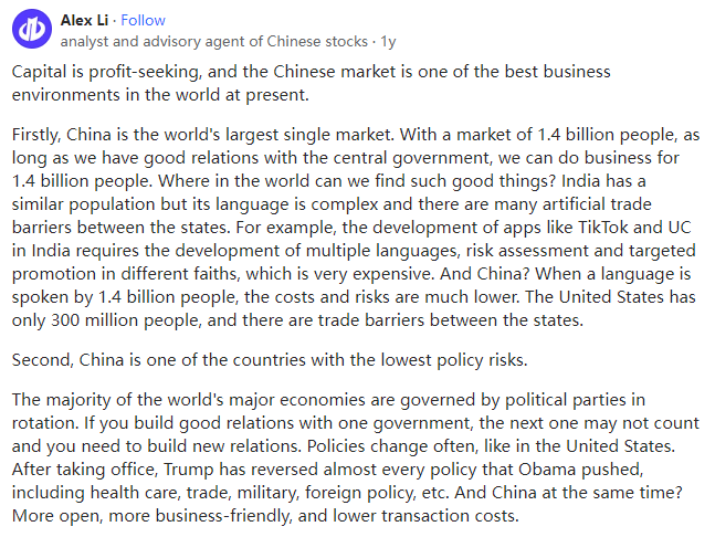 资本是逐利的,中国市场拥有目前世界上最好的营商环境之一。