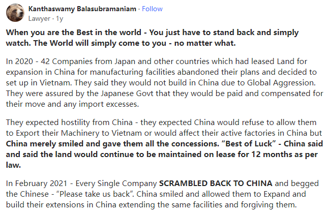 2021年2月,每一家(搬去越南的)公司都争先恐后地回到中国并乞求中国人“请带我们回去”,中国微笑着允许它们在中国扩展和建设他们的生产设施并原谅了它们。