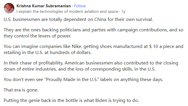 我无法用任何事实来支持你的说法,但对我来说,公司“支持”违背其商业利益和逻辑的政策听起来是很奇怪的。每个地方的劳动力成本都在不断上升,并将继续上升。因此,如果印度或越南只能在劳动力成本上竞争,那么它们将无法维持长期的竞争优势。顺便说一句,劳动力成本并不是中国成为顶级制造目的地的原因。无论如何,在我看来,根据“地缘政治”做出商业决策不是一种好的做法。
