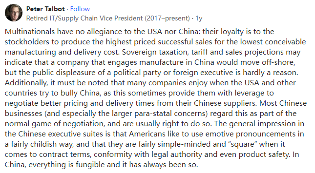 跨国公司既不效忠美国也不效忠中国:它们会以最低的制造和交付成本实现最高价格的成功销售来对股东效忠。主权税收、关税和销售预期可能表现在中国从事制造业的公司将迁往海外上,但公众对政党或外国高管的不满很难成为理由。此外,必须注意的是,当美国和其他国家试图欺负中国时,许多公司都很高兴,因为这有时能为它们在与中国供应商谈判时提供更好的价格和交货时间的机会。大多数中国企业(尤其是较大的准国有企业)会将此视为正常谈判游戏的一部分,而且通常这样做是正确的。中国高管的总体印象是美国人喜欢以一种相当幼稚的方式使用情绪化的声明,在合同条款、遵守法律权威甚至产品安全方面,他们的思维相当简单和“直率”。在中国,一切都是可替代的,而且一直如此。