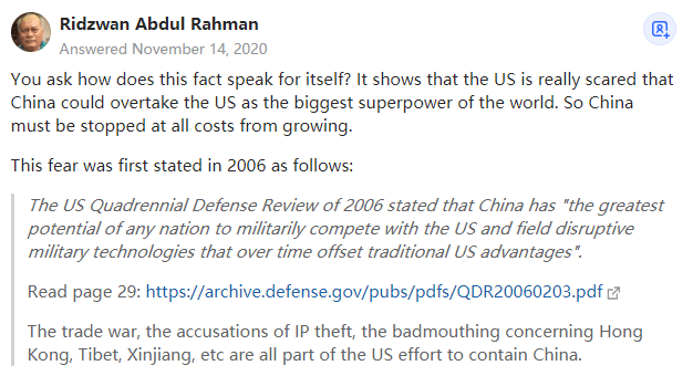 美国2006年的《四年防务评估》(Quadrennial Defense Review)中指出,中国“在军事上与美国竞争的潜力是所有国家中最大的,而且随着时间的推移,中国拥有的破坏性军事技术会抵消美国的传统优势”。阅读第29页:https://archive.defense.gov/pubs/pdfs/QDR20060203.pdf针对贸易战、知识产权盗窃指控、香港、XZ、XJ等的坏话都是美国遏制中国的努力的一部分。不幸的是,我有预感,这种不信任(untrustworthiness)与白人-基督教至上有关。